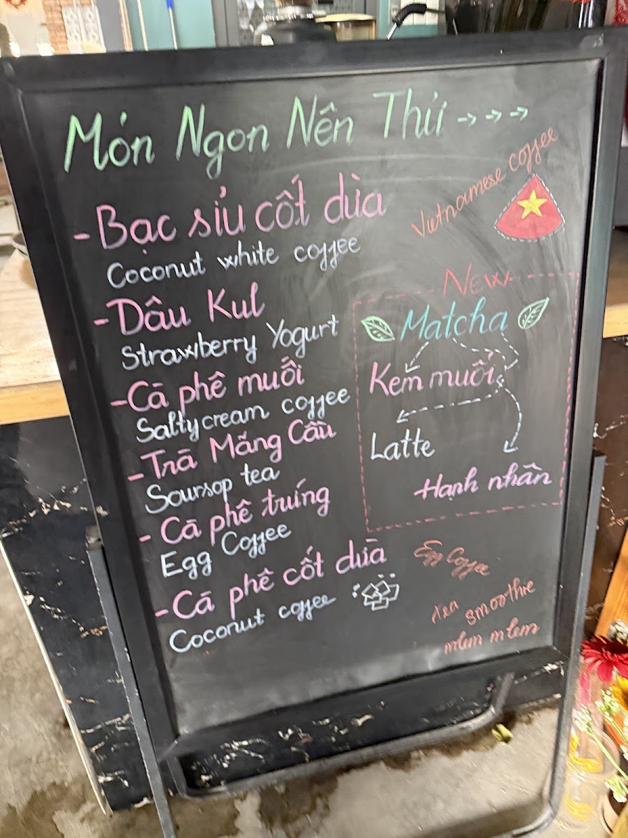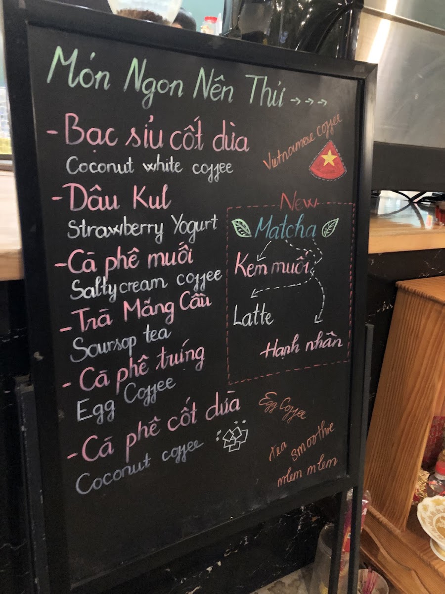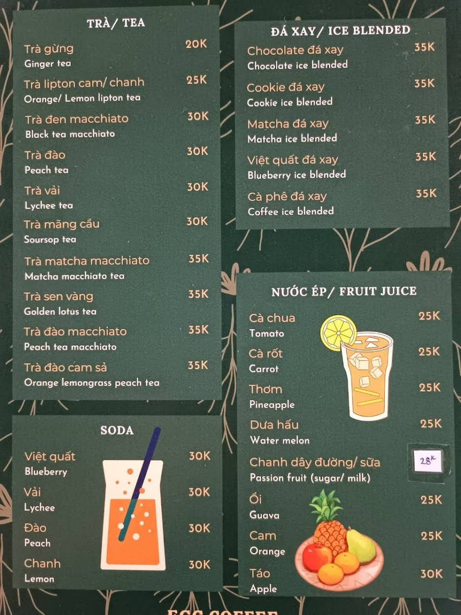 The menu primarily features a variety of coffee beverages with a focus on traditional Vietnamese-style coffee preparations. Key offerings include different versions of egg coffee, a unique drink made with whipped egg yolk combined with coffee, as well as chilled fruit-based drinks such as blended blueberry and pineapple juices.